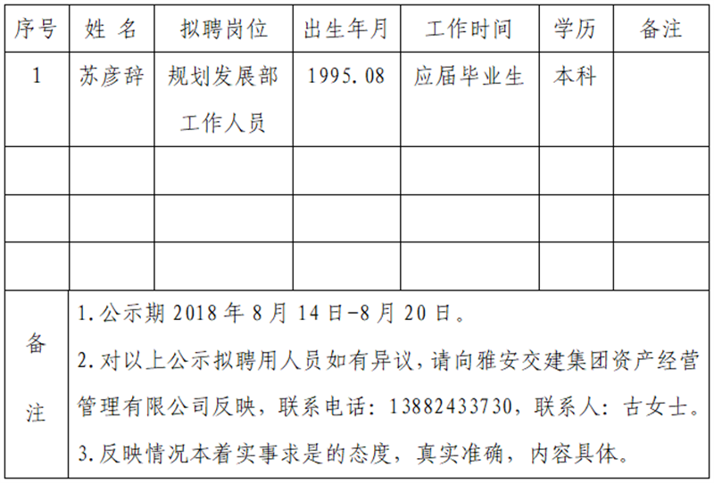 通過(guò)公開報(bào)名、資格審查、筆試、面試等程序,經(jīng)雅安交建集團(tuán)資產(chǎn)經(jīng)營(yíng)管理有限公司研究擇優(yōu)確定以下1名擬聘用人員,現(xiàn)公示名單如下: