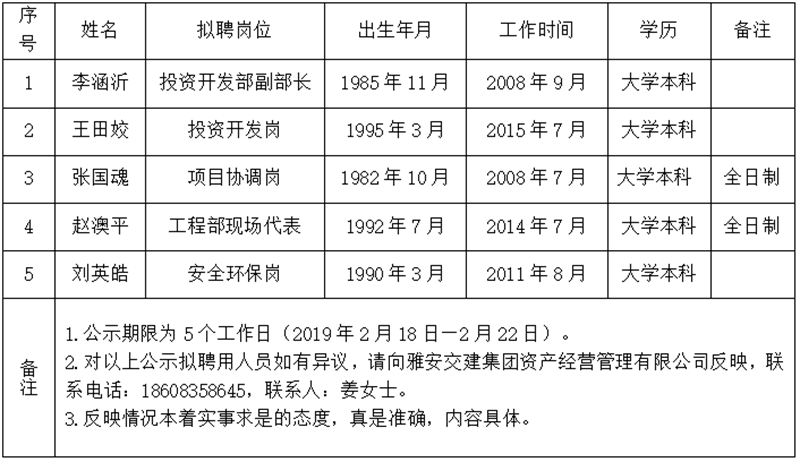 通過公開報名、資格審查、筆試、面試等程序,經(jīng)雅安交建集團資產(chǎn)經(jīng)營管理有限公司研究,對以下
