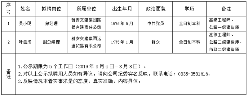 雅安交建集團子公司擬聘用人員公示(路橋、運通)