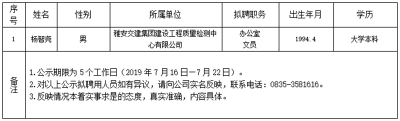 雅安交建集團子公司擬聘用人員公示(工程質(zhì)量檢測中心)