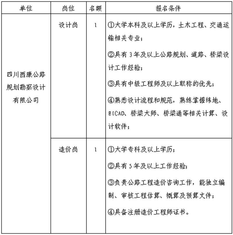 根據(jù)發(fā)展需要,決定面向社會公開招聘雅安市交通建設(shè)(集團(tuán))有限責(zé)任公司(以下簡稱“雅安交建集團(tuán)”)所屬子公司工作人員2名,現(xiàn)將有關(guān)事項(xiàng)公告如下: