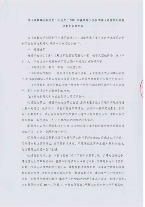 四川康藏路橋有限責(zé)任公司318·川藏線零公里自駕游大本營臨時(shí)用地臨時(shí)招租征集公告