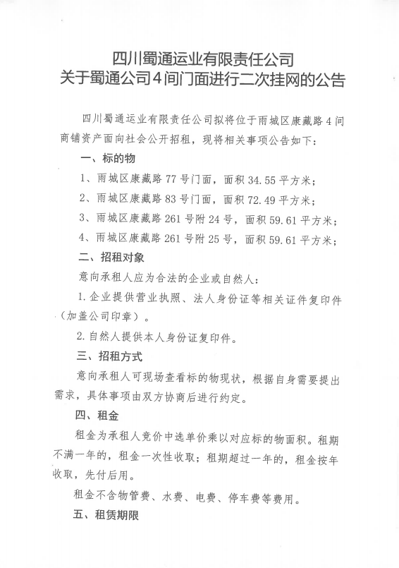 四川蜀通運(yùn)業(yè)有限責(zé)任公司關(guān)于蜀通公司4間門面進(jìn)行二次掛網(wǎng)的公告附件