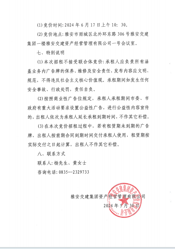 雅安交建集團(tuán)資產(chǎn)經(jīng)營管理有限公司關(guān)于戶外廣告位競價招租的公告