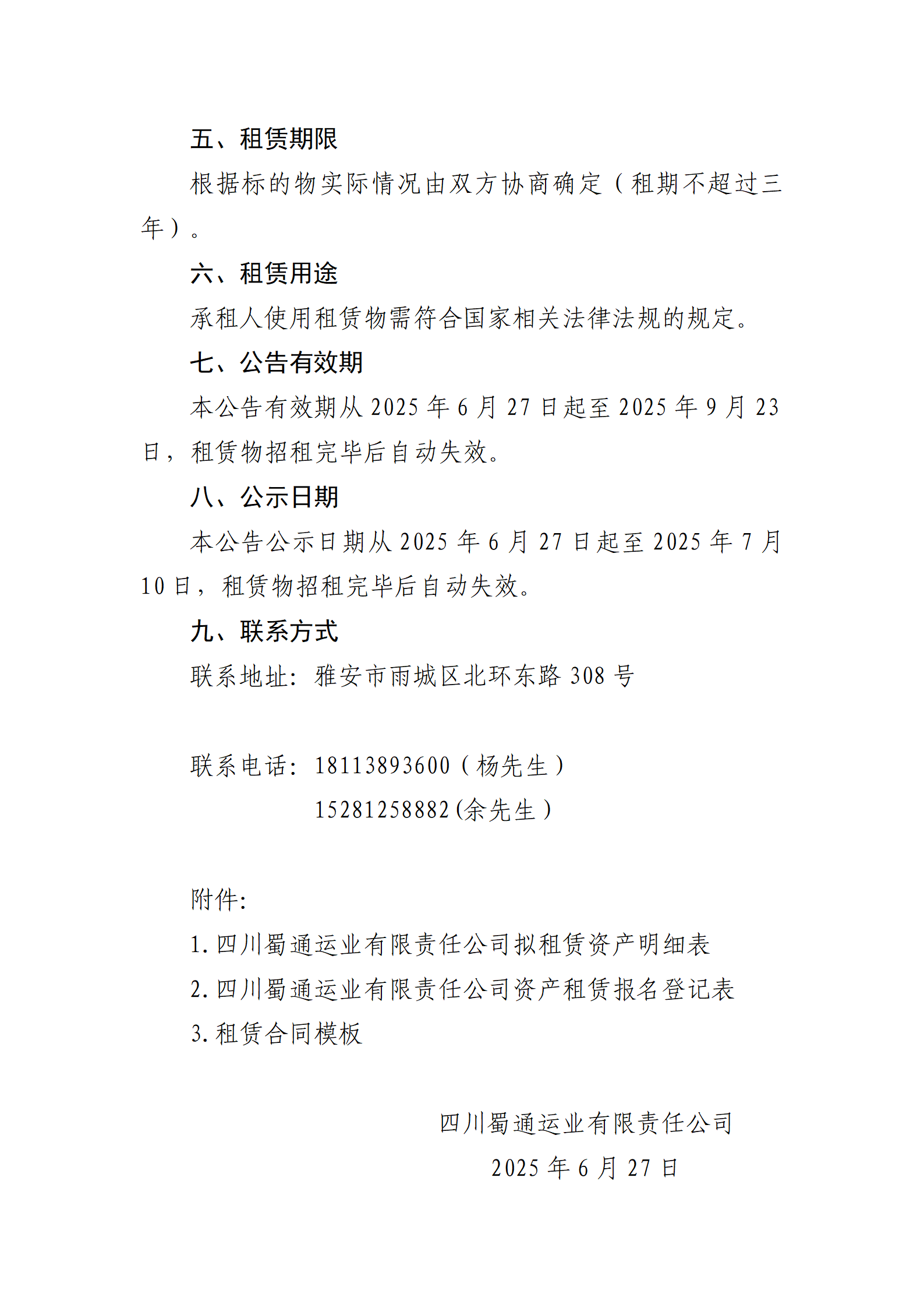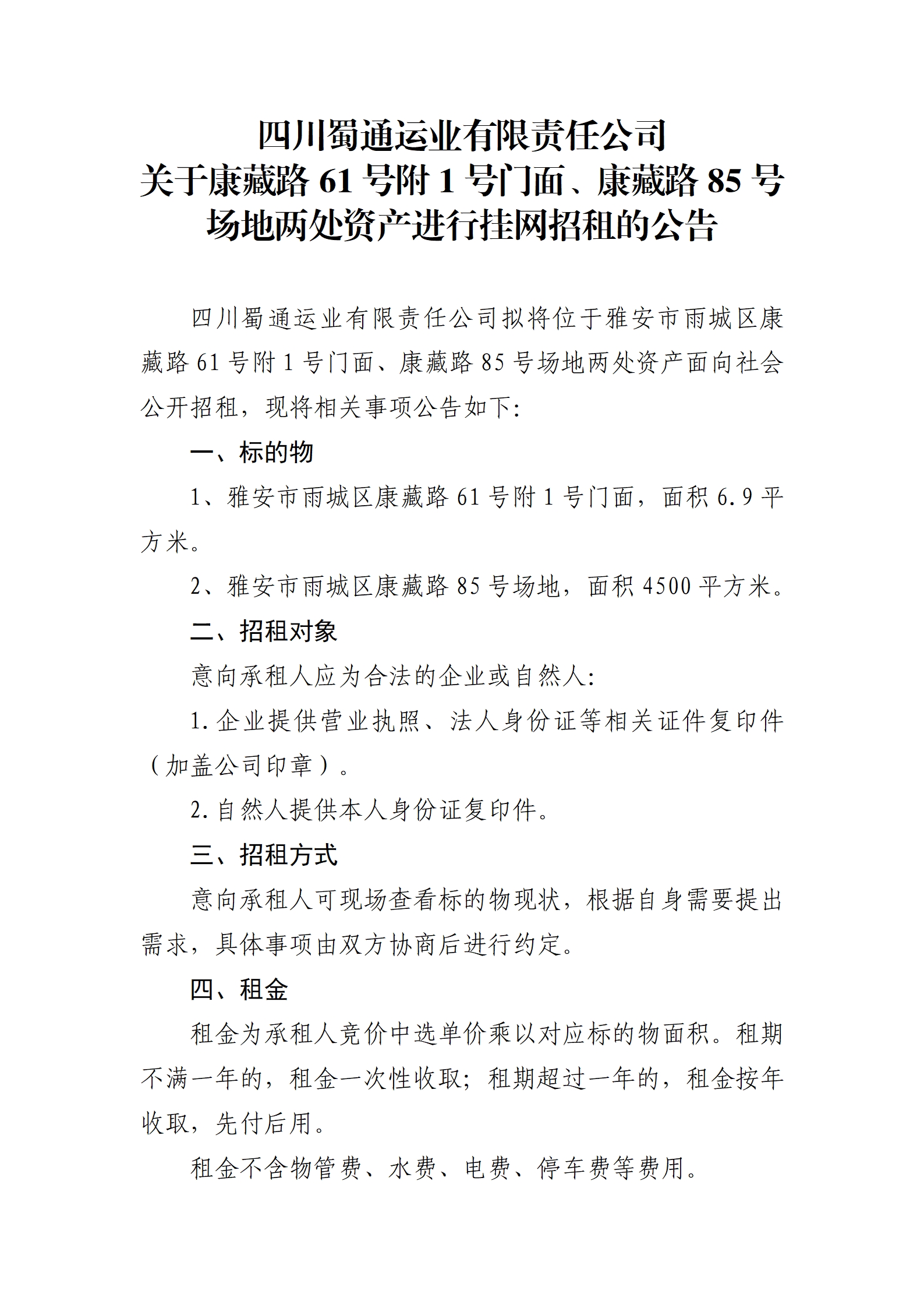 四川蜀通運業(yè)有限責任公司 關于康藏路61號附1號門面、康藏路85號場地兩處資產進行掛網(wǎng)招租的公告