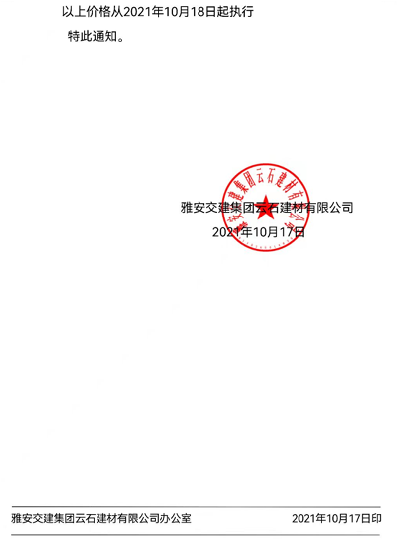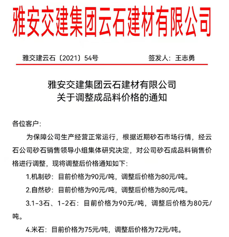 雅安交建集團云石公司關于調(diào)整成品料銷售價格的通知(2021.10.17)