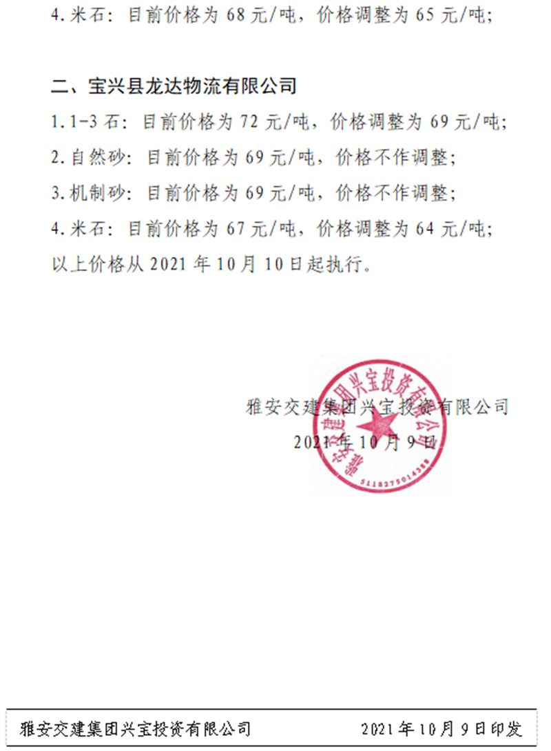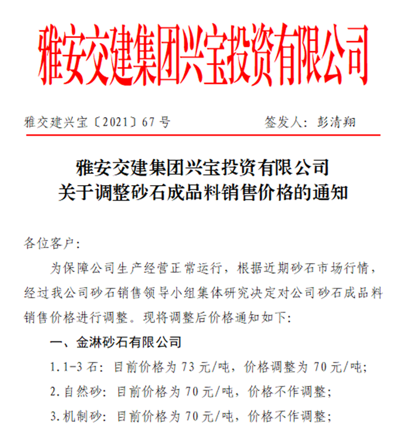 雅安交建集團興寶公司關(guān)于調(diào)整砂石成品料銷售價格的通知(2021.9.28)