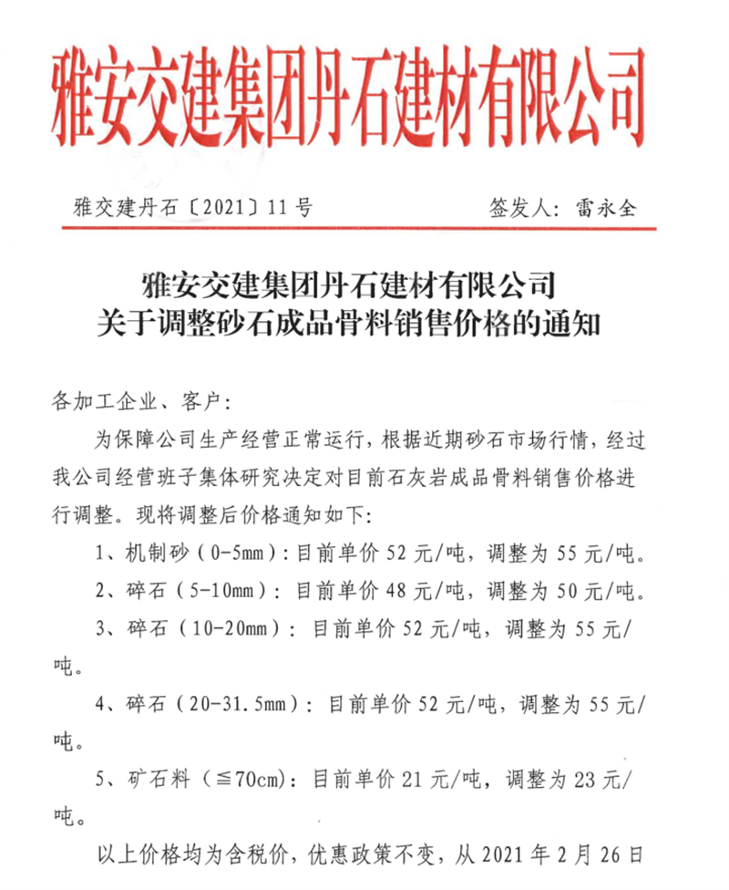 雅安交建集團(tuán)丹石公司石灰?guī)r成品骨料掛牌價(2021.2.25)