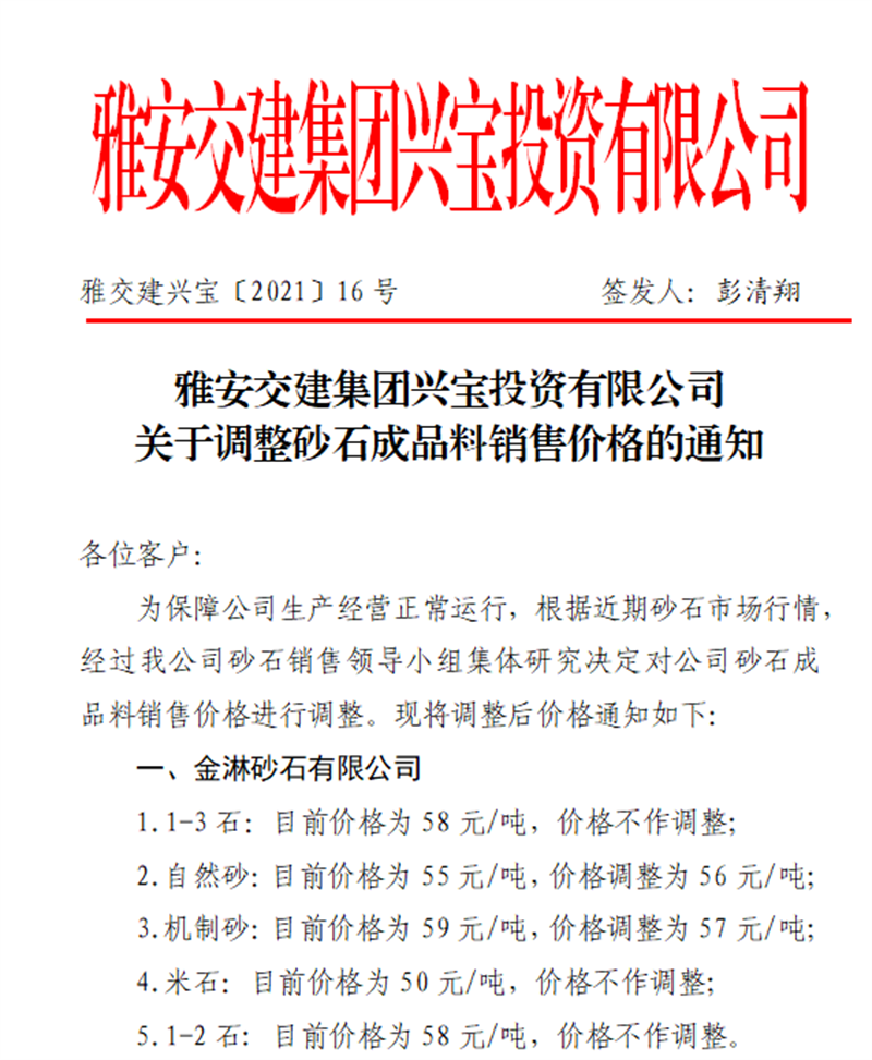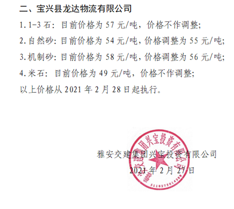 雅安交建集團(tuán)興寶公司砂石骨料銷售價(jià)格情況表(2021.2.28)