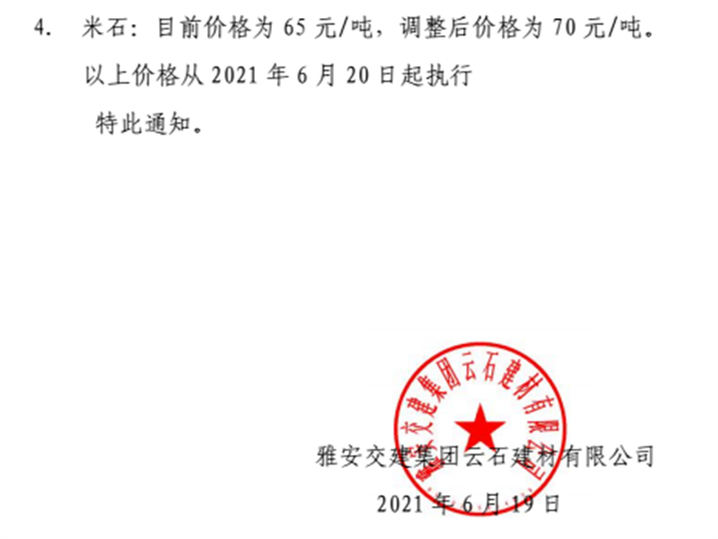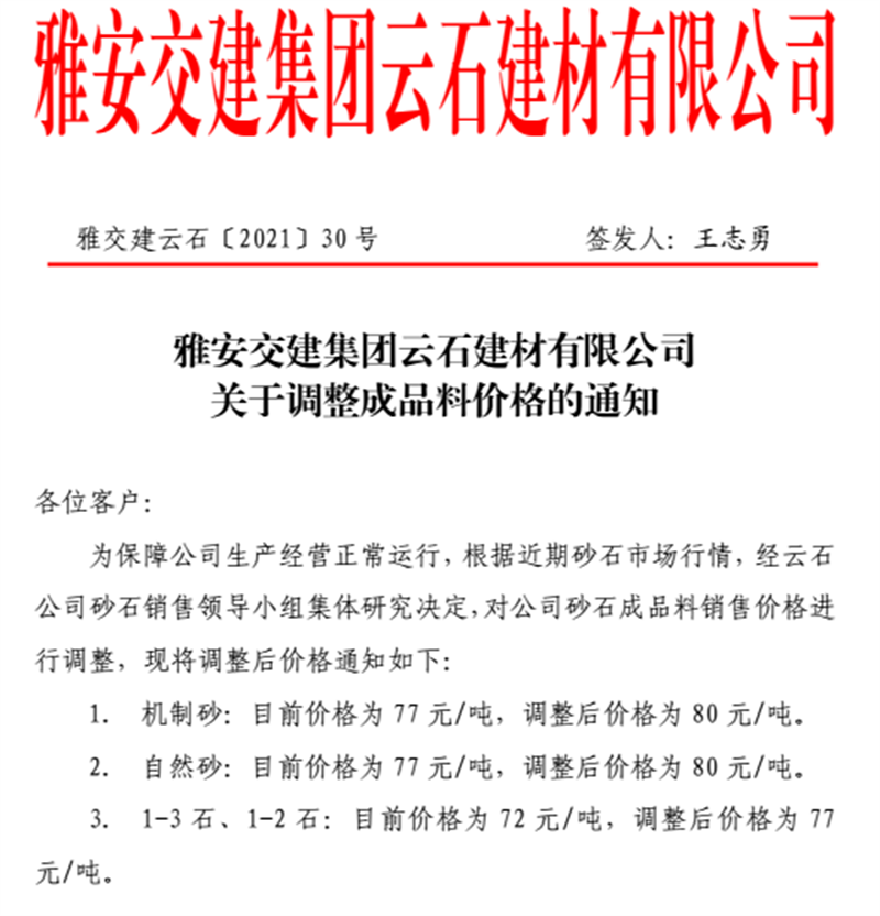 雅安交建集團(tuán)云石公司砂石骨料銷售價格情況表(2021.6.20)