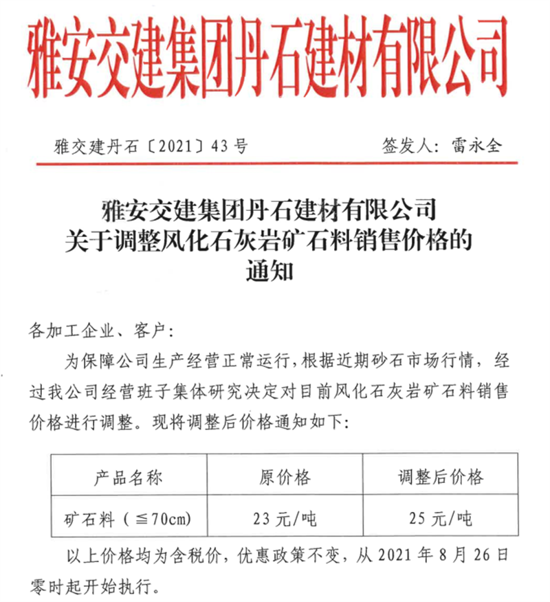 雅安交建集團丹石公司關(guān)于調(diào)整風化石灰?guī)r礦石料銷售價格的通知