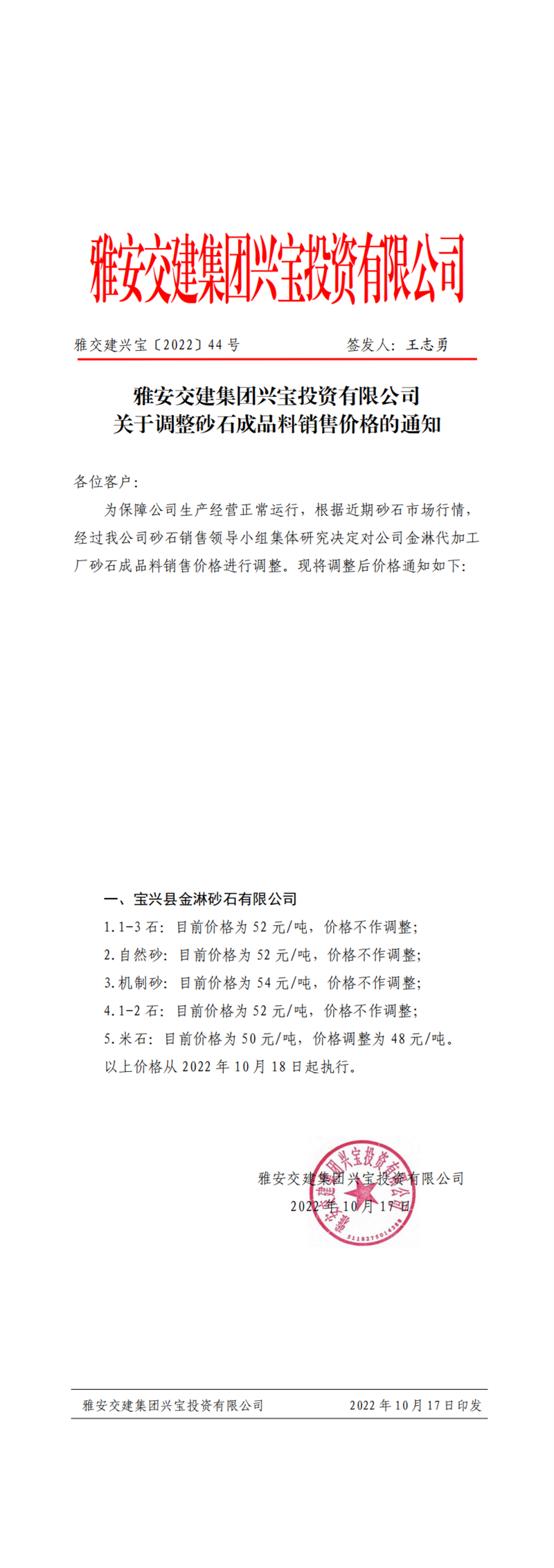雅交建興寶〔2022〕44號 關(guān)于調(diào)整砂石成品料銷售價格的通知10.17