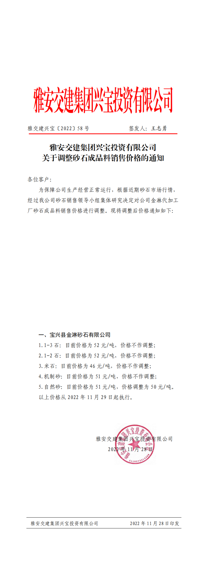 雅交建興寶〔2022〕58號(hào) 關(guān)于調(diào)整砂石成品料銷售價(jià)格的通知