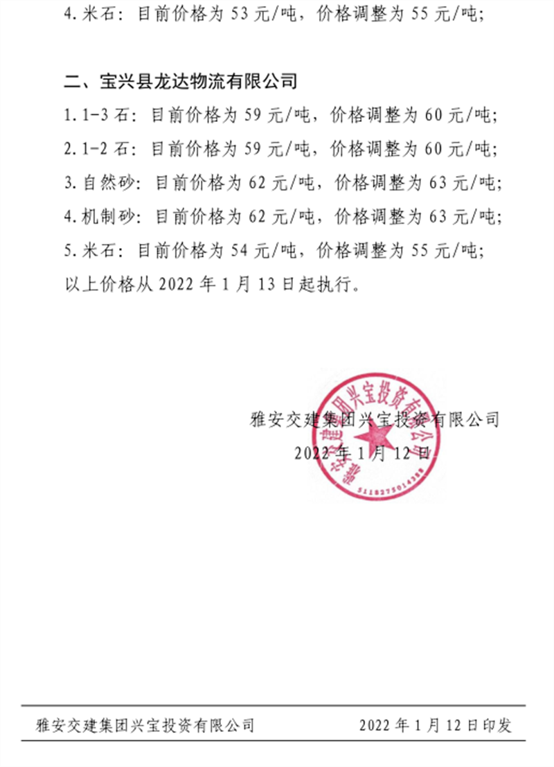 雅安交建集團(tuán)丹石公司關(guān)于調(diào)整砂石成品骨料銷售價(jià)格的通知(2022.1.5)
