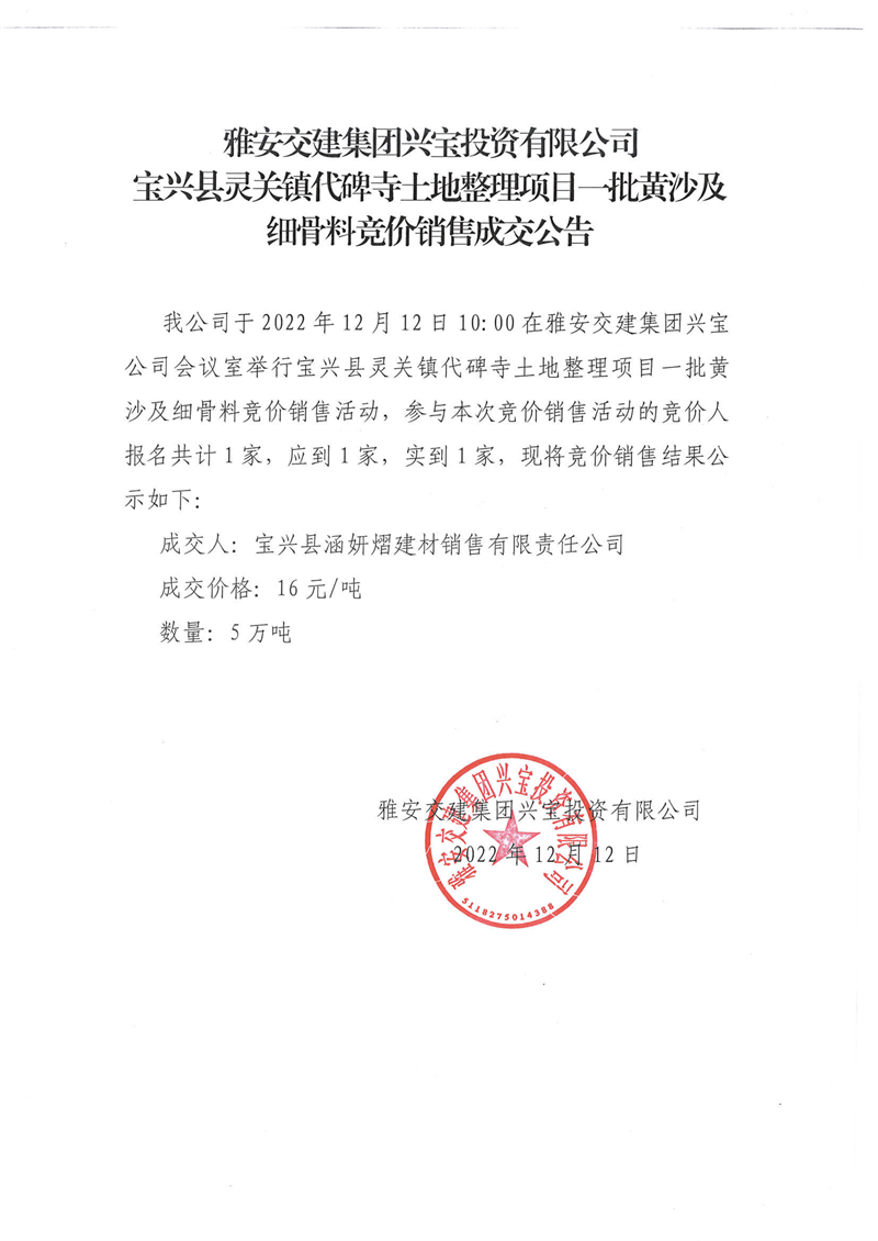 雅安交建集團(tuán)興寶投資有限公司寶興縣靈關(guān)鎮(zhèn)代碑寺土地整理項(xiàng)目5萬噸黃沙及細(xì)骨料競(jìng)價(jià)銷售成交公告(2022-12-12)