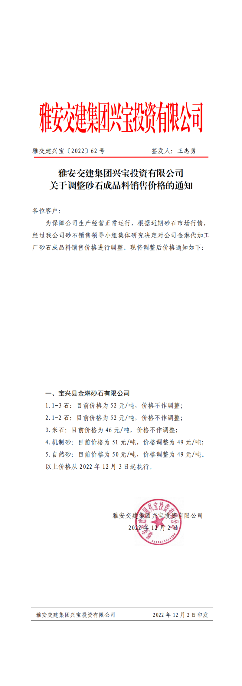 ÑŽ»½¨ÅdŒš¡²2022¡³62Ì– êP(gu¨¡n)ÓÚÕ{(di¨¤o)Õûɰʯ³ÉÆ·ÁÏäNÊÛƒr¸ñµÄ֪ͨ£¨2022-12-2£©