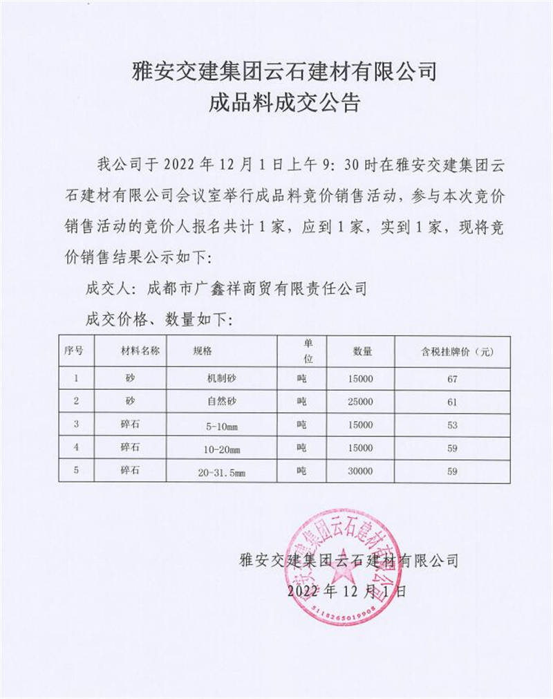 雅安交建集團云石建材有限公司成品料競價銷售成交公告(2022-12-01)