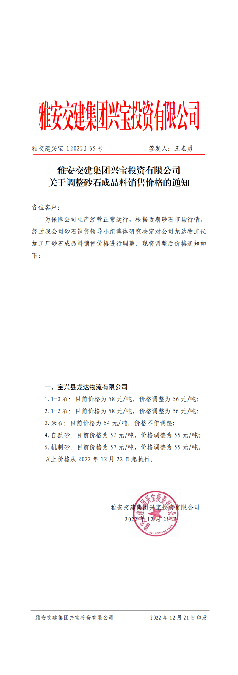 雅交建興寶〔2022〕65號 關(guān)于調(diào)整砂石成品料銷售價(jià)格的通知(2022-12-21)