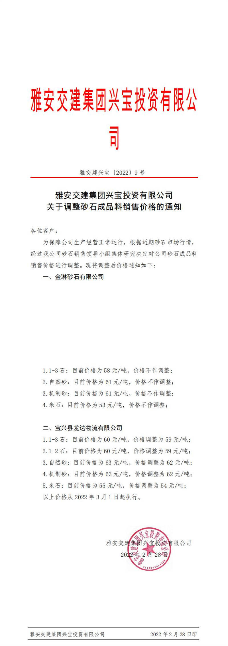 雅安交建集團興寶投資有限公司 關于調整砂石成品料銷售價格的通知(2022-2-23)