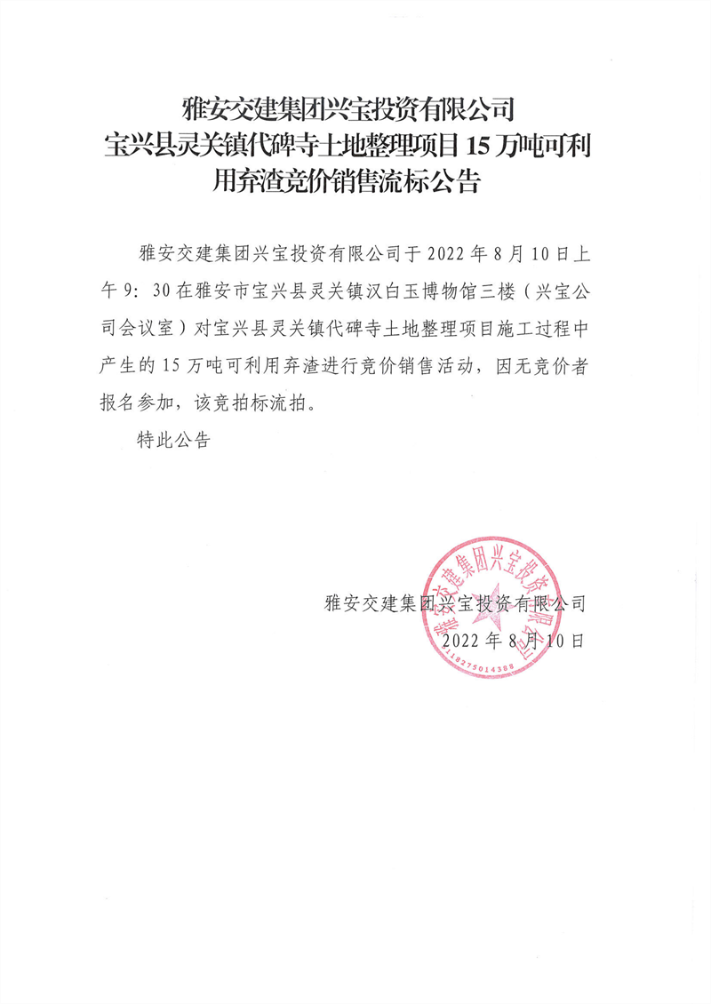 雅安交建集團(tuán)興寶投資有限公司靈關(guān)鎮(zhèn)代碑寺土地整理項(xiàng)目15萬噸可利用棄渣競價銷售流標(biāo)公告