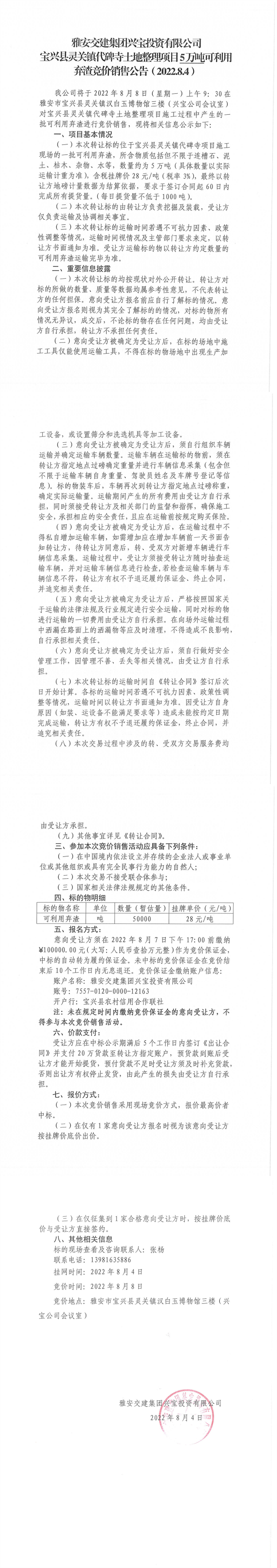 雅安交建集團(tuán)興寶投資有限公司靈關(guān)鎮(zhèn)代碑寺土地整理項(xiàng)目5萬噸可利用棄渣競價銷售公告(2022.8.4)