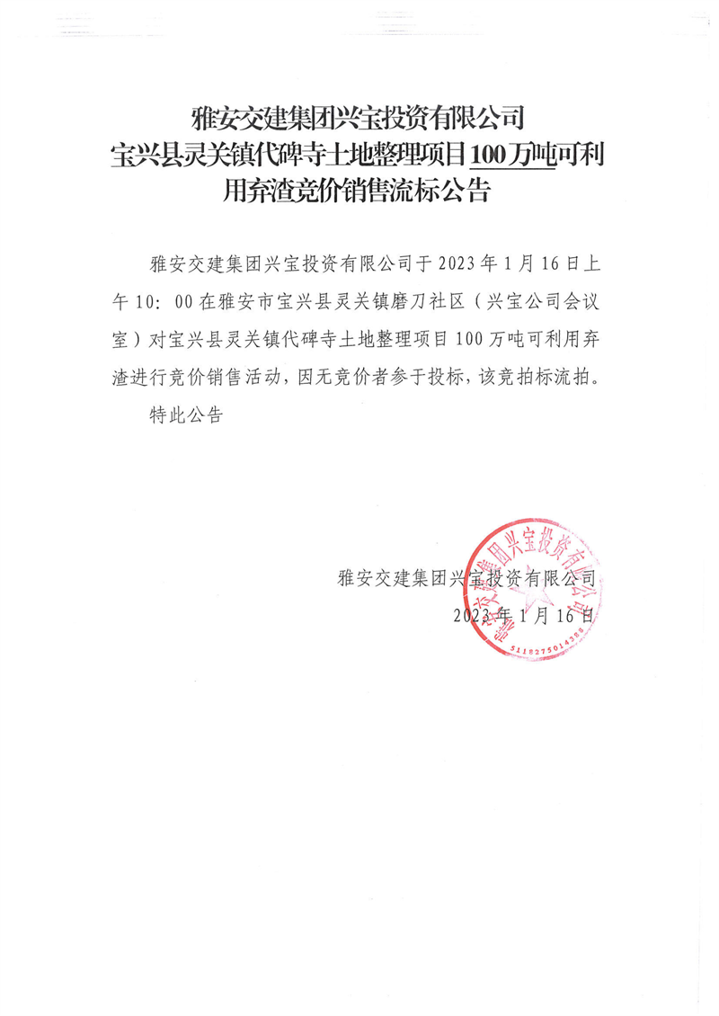 雅安交建集團(tuán)興寶投資有限公司100萬(wàn)噸可利用棄渣競(jìng)價(jià)銷售流標(biāo)公告(2023.1.16)