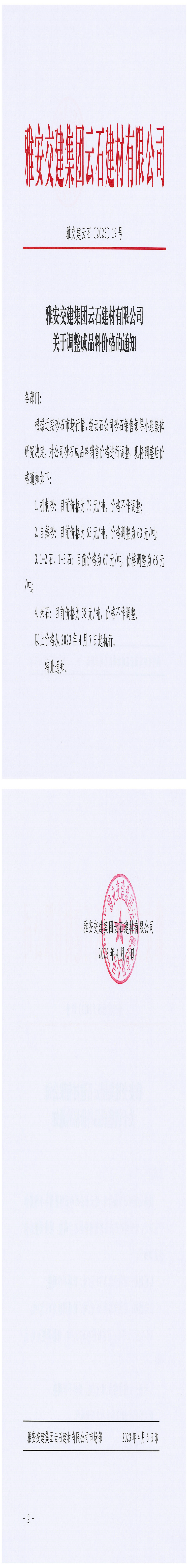 雅安交建集團云石建材有限公司關于調整成品料價格的通知(2023-4-6)