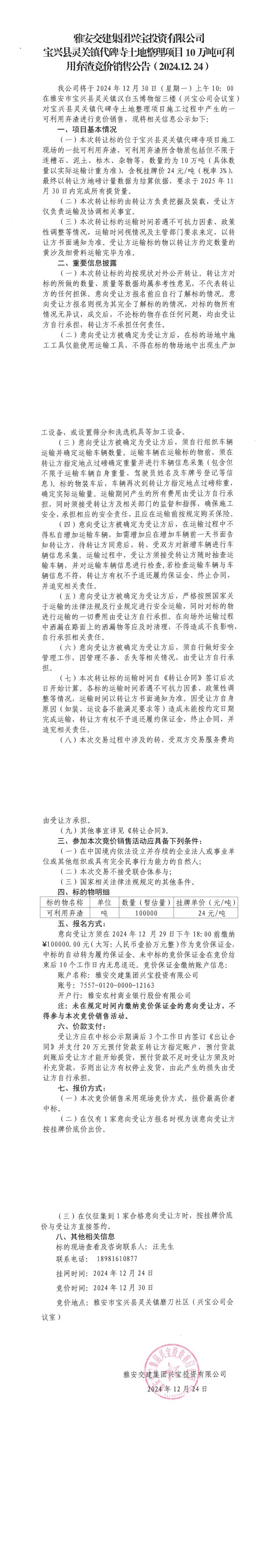 雅安交建集團(tuán)興寶投資有限公司靈關(guān)鎮(zhèn)代碑寺土地整理項(xiàng)目10萬噸可利用棄渣競價(jià)銷售公告(2024.12.24)